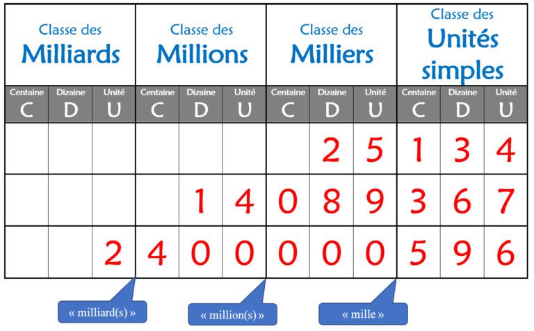 - Dans un nombre, les chiffres sont rangés par classes : unités simples / milliers / millions / milliards / etc.