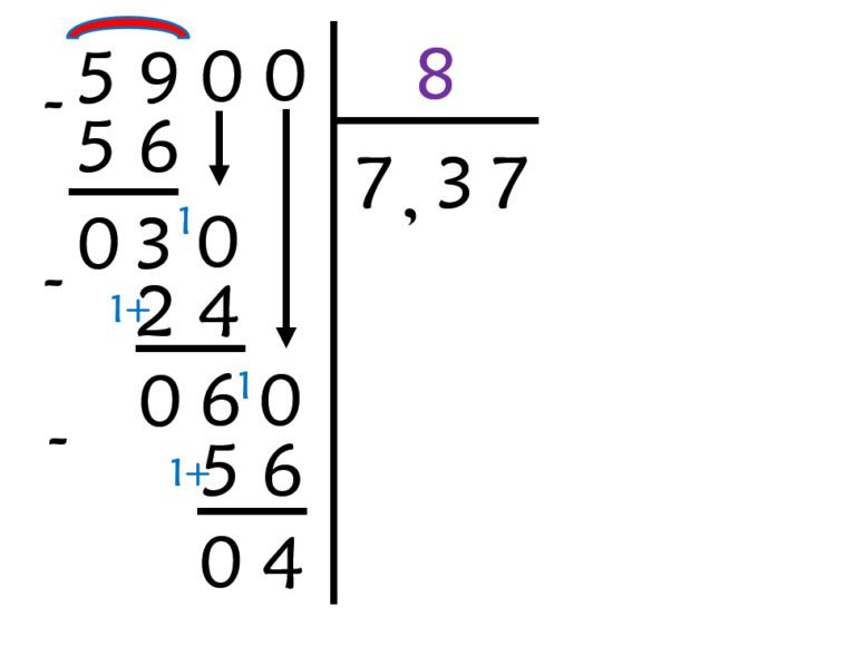 Comme il y a toujours un reste, l’opération n’est pas terminée : – elle peut être arrêtée en l’état, ce qui donnerait : 59 ÷ 8 = 7,37 r 0,04 (l’opération s’étant arrêtée aux centièmes au quotient, le reste 4 correspond à 4 centièmes, donc 0,04) – elle peut être continuée, en allant jusqu’aux millièmes au quotient. |
